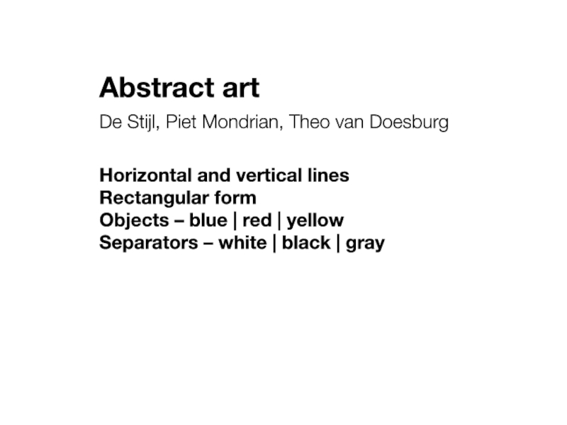 Abstract artDe Stijl, Piet Mondrian, Theo van DoesburgHorizontal and vertical linesRectangular formObjects – blue | red |