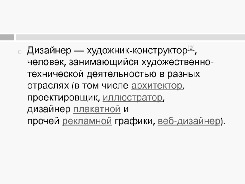 Слайд 9Дизайнер — художник-конструктор[2], человек, занимающийся художественно-технической деятельностью в разных отраслях (в