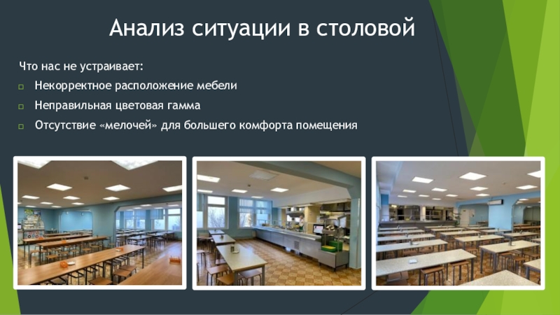 Анализ ситуации в столовойЧто нас не устраивает:Некорректное расположение мебелиНеправильная цветовая гаммаОтсутствие «мелочей» для большего комфорта помещения