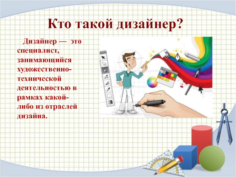 Кто такой дизайнер?  Дизайнер —  это специалист, занимающийся художественно-технической деятельностью в рамках какой-либо из отраслей дизайна.