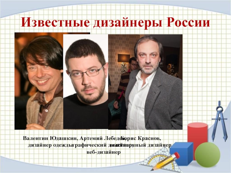 Известные дизайнеры РоссииВалентин Юдашкин, дизайнер одеждыАртемий Лебедев, графический дизайнер, веб-дизайнерБорис Краснов, выставочный дизайнер