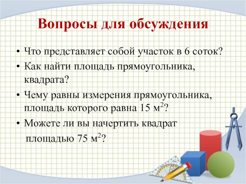 Вопросы для обсужденияЧто представляет собой участок в 6 соток?Как найти площадь прямоугольника, квадрата?Чему равны измерения прямоугольника, площадь