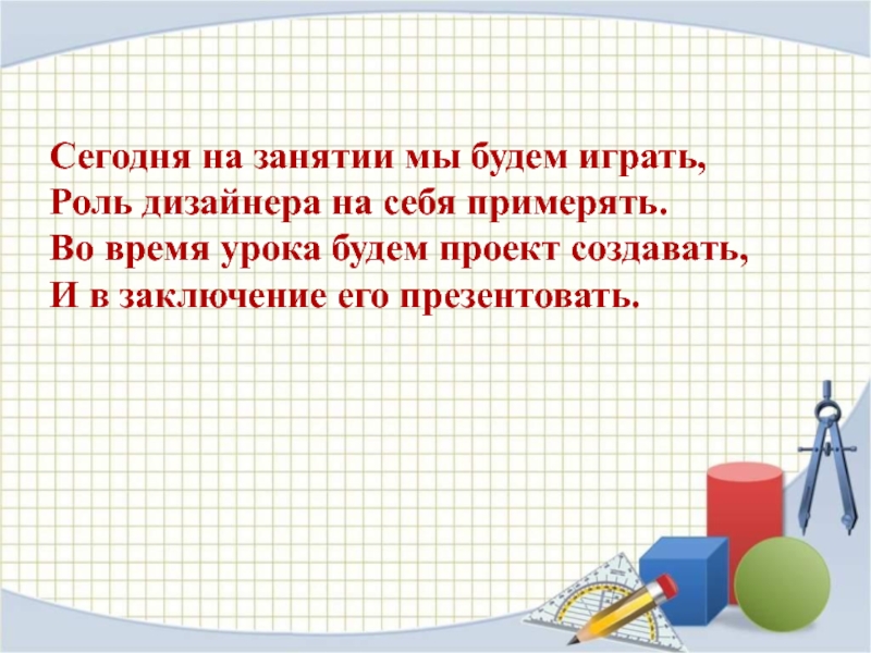 Слайд 2Сегодня на занятии мы будем играть, Роль дизайнера на себя примерять. Во