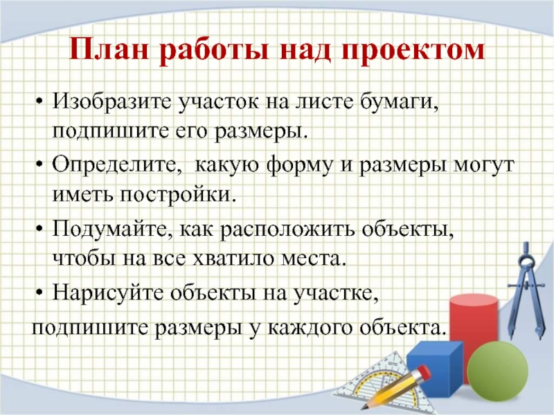 План работы над проектомИзобразите участок на листе бумаги, подпишите его размеры.Определите, какую форму и размеры могут иметь