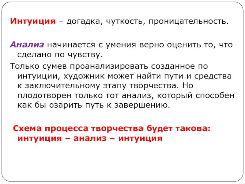 Схема процесса творчества будет такова: интуиция – анализ – интуиция