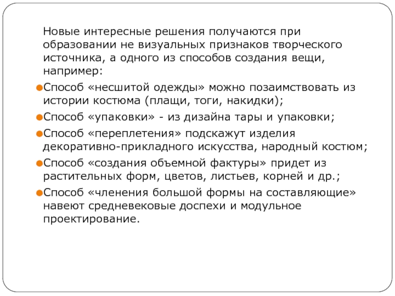 не визуальных признаков творческого источника, а одного из способов создания вещи (способ несшитой одежды, способ упаковки, способ переплетения).