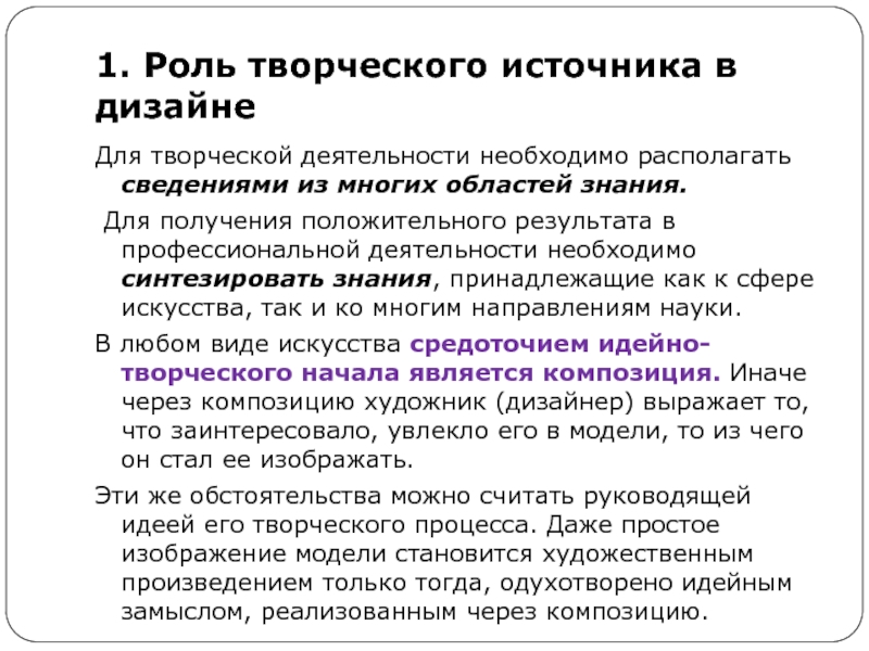 В любом виде искусства средоточием идейно-творческого начала является композиция. Иначе через композицию художник (дизайнер) выражает то, что заинтересовало, увлекло его в модели, то из чего он стал ее изображать.