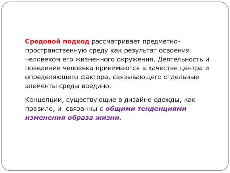Слайд 14Средовой подход рассматривает предметно-пространственную среду как результат освоения человеком его