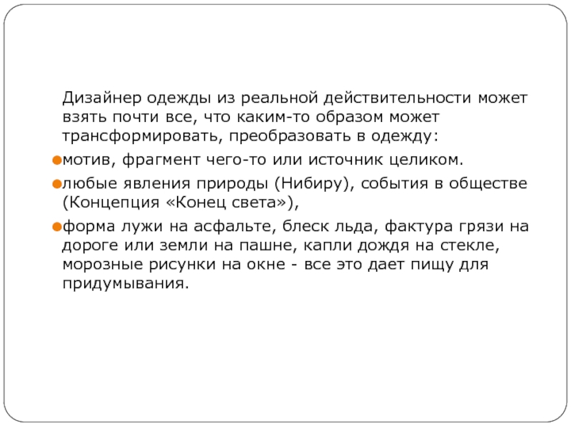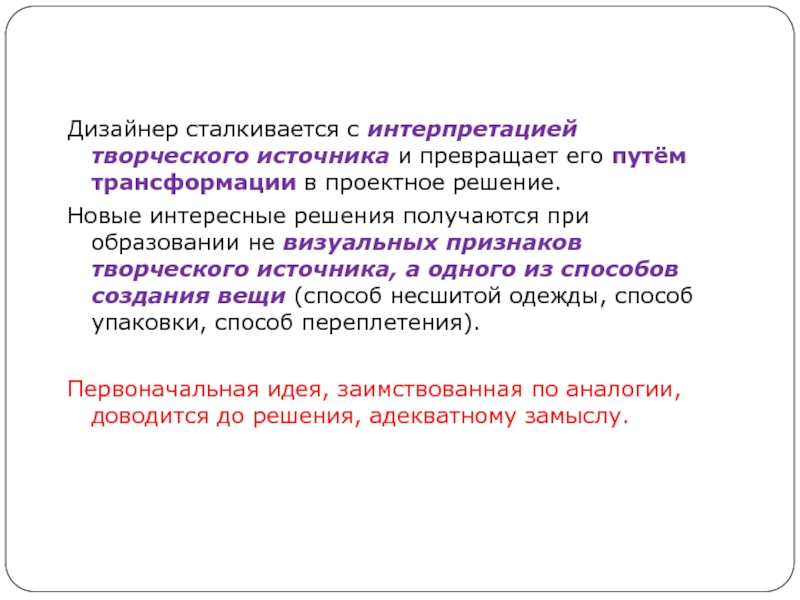 Слайд 30Дизайнер сталкивается с интерпретацией творческого источника и превращает его путём