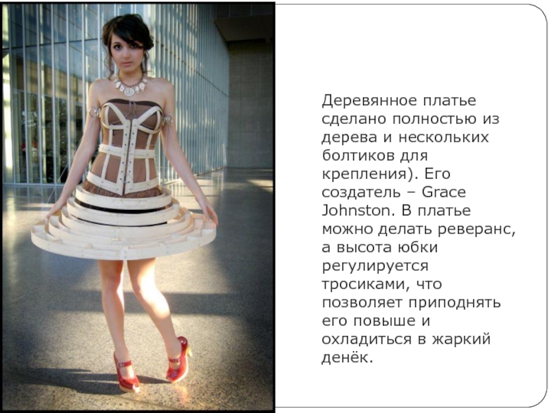 Слайд 32Деревянное платье сделано полностью из дерева и нескольких болтиков для