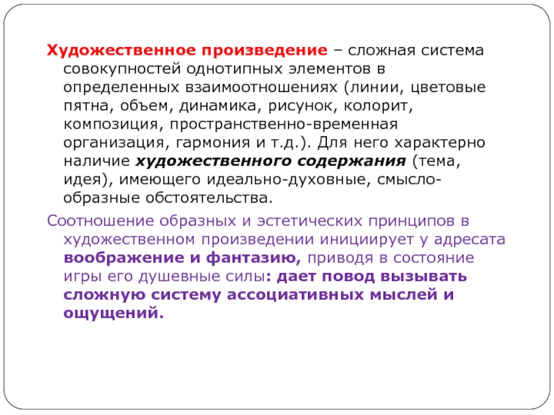 Соотношение образных и эстетических принципов в художественном произведении инициирует у адресата воображение и фантазию, приводя в состояние игры его душевные силы: дает повод вызывать сложную систему ассоциативных мыслей и ощущений.