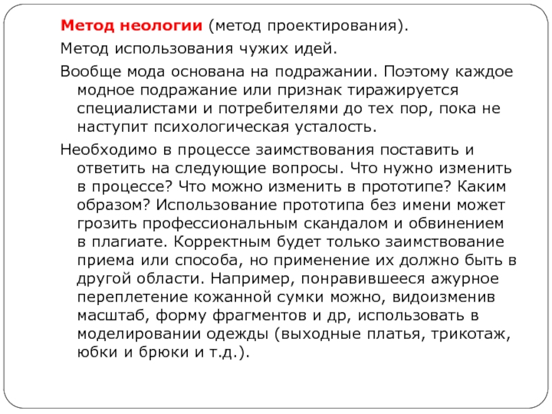 Необходимо в процессе заимствования поставить и ответить на следующие вопросы. Что нужно изменить в процессе? Что можно изменить в прототипе? Каким образом? Использование прототипа без имени может грозить профессиональным скандалом и обвинением в плагиате. Корректным будет только заимствование приема или способа, но применение их должно быть в другой области. Например, понравившееся ажурное переплетение кожанной сумки можно, видоизменив масштаб, форму фрагментов и др, использовать в моделировании одежды (выходные платья, трикотаж, юбки и брюки и т.д.).