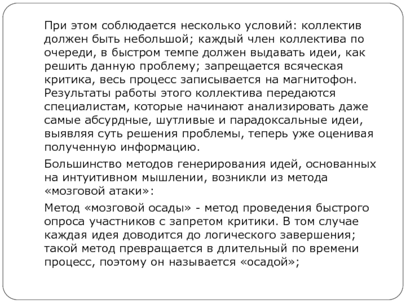 Большинство методов генерирования идей, основанных на интуитивном мышлении, возникли из метода «мозговой атаки»: