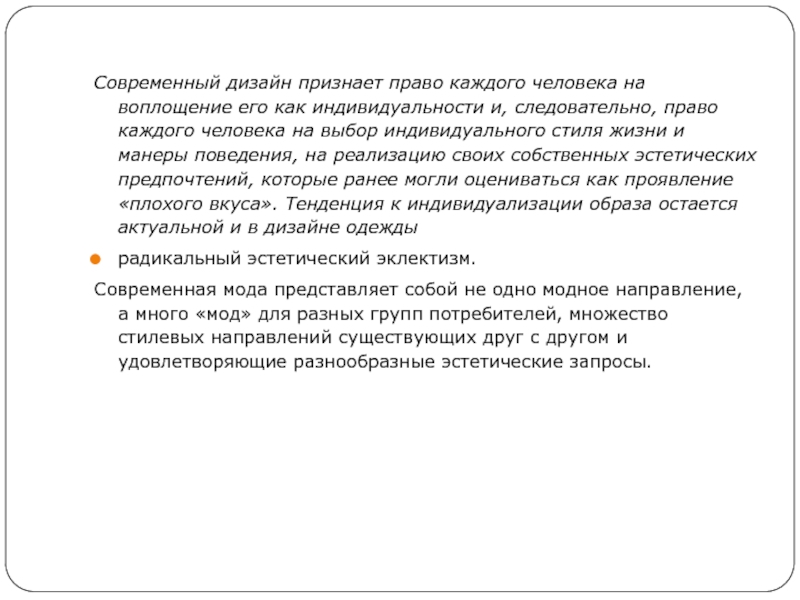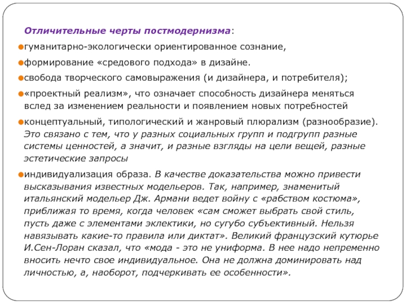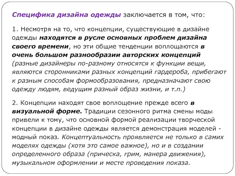 проблем дизайна своего времени, но эти общие тенденции воплощаются в очень большом разнообразии авторских концепций (разные дизайнеры по-разному относятся к функции вещи, являются сторонниками разных концепций гардероба, прибегают к разным способам формообразования, предназначают свою одежду людям, ведущим разный образ жизни, и т.п.)