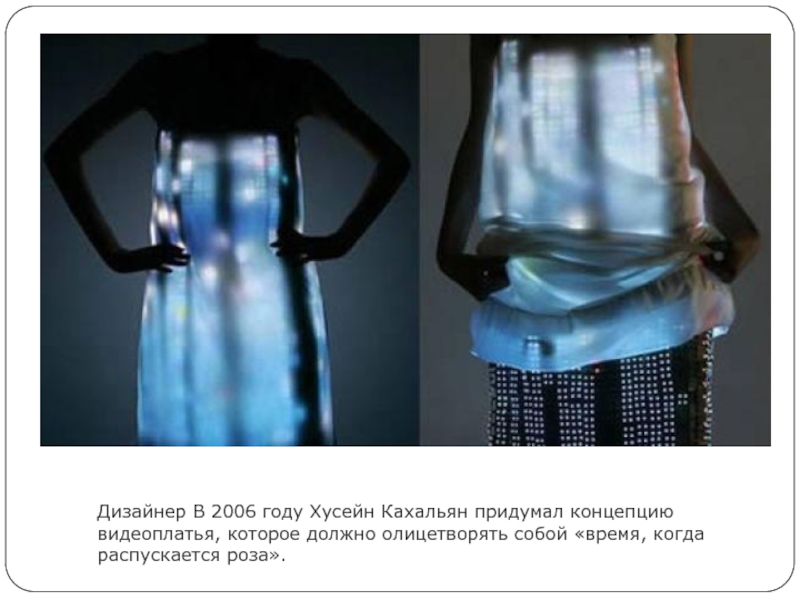 Слайд 49Дизайнер В 2006 году Хусейн Кахальян придумал концепцию видеоплатья, которое