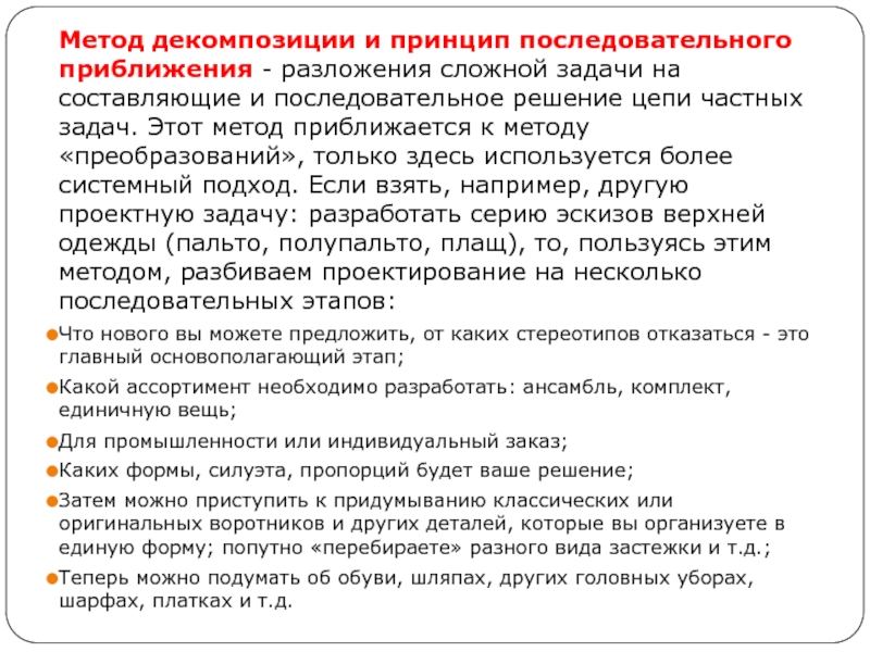 приближается к методу «преобразований», только здесь используется более системный подход. Если взять, например, другую проектную задачу: разработать серию эскизов верхней одежды (пальто, полупальто, плащ), то, пользуясь этим методом, разбиваем проектирование на несколько последовательных этапов: