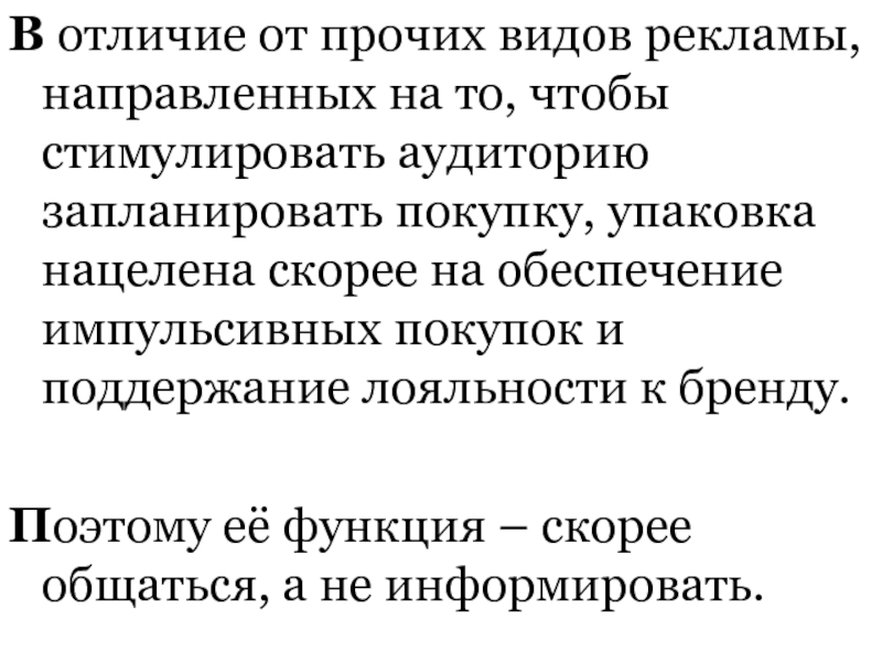 стимулировать аудиторию запланировать покупку, упаковка нацелена скорее на обеспечение импульсивных