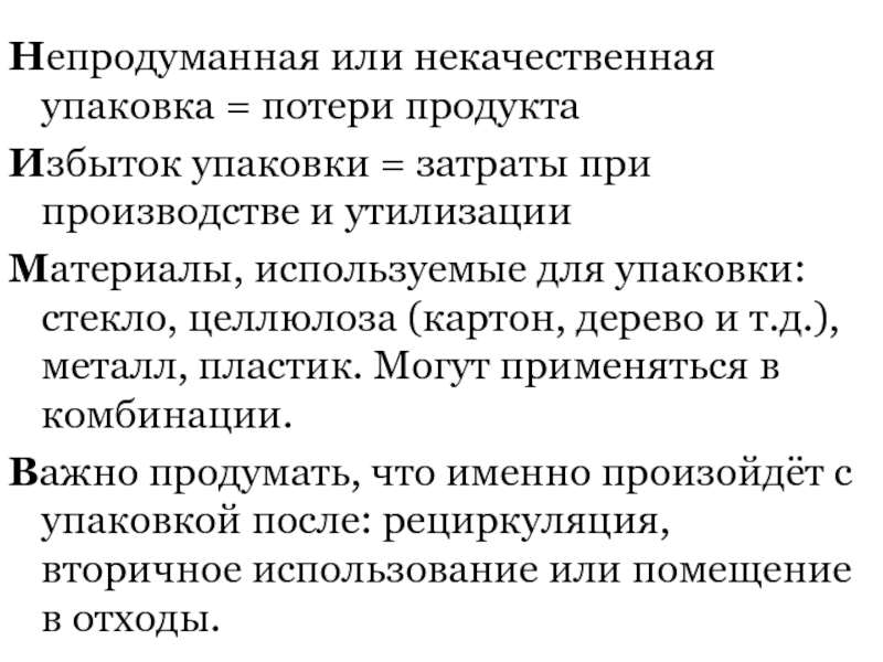 Важно продумать, что именно произойдёт с упаковкой после: рециркуляция, вторичное использование или помещение в отходы.