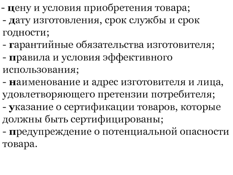 - перечень основных потребительских свойств товара (инструкцию), а для продуктов питания - состав, калорийность, содержание вредных веществ в сравнении с нормативными требованиями, противопоказания;