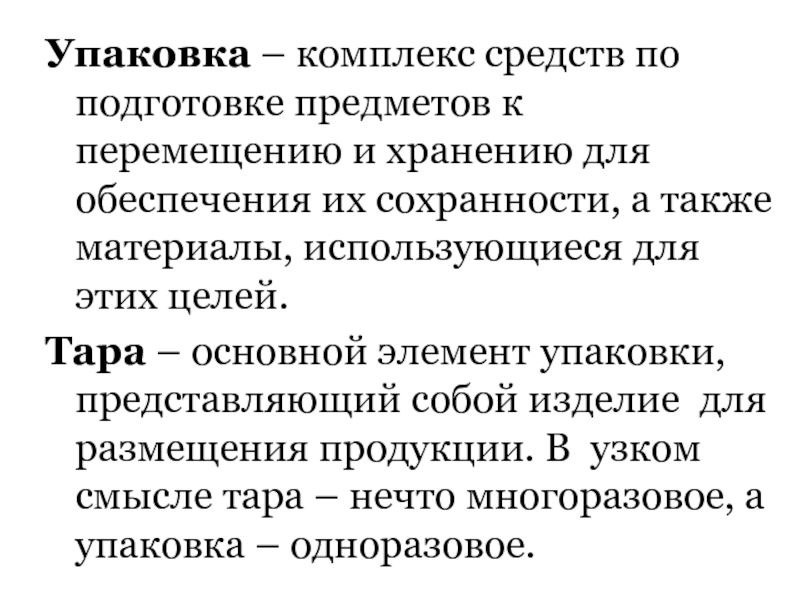Тара – основной элемент упаковки, представляющий собой изделие для размещения продукции. В узком смысле тара – нечто многоразовое, а упаковка – одноразовое.