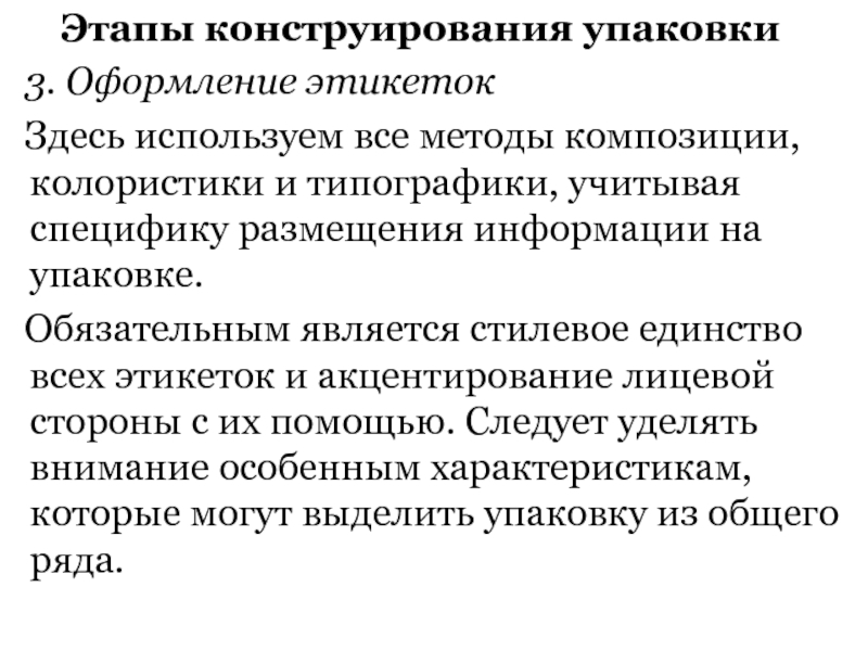 единство всех этикеток и акцентирование лицевой стороны с их помощью. Следует уделять внимание особенным характеристикам, которые могут выделить упаковку из общего ряда.
