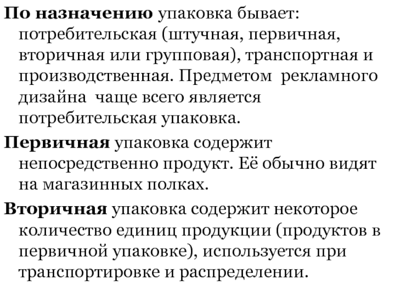 Слайд 4По назначению упаковка бывает: потребительская (штучная, первичная, вторичная или групповая),