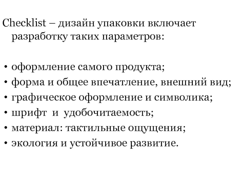 Checklist – дизайн упаковки включает разработку таких параметров: