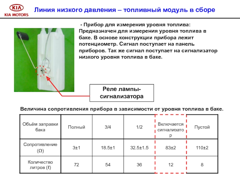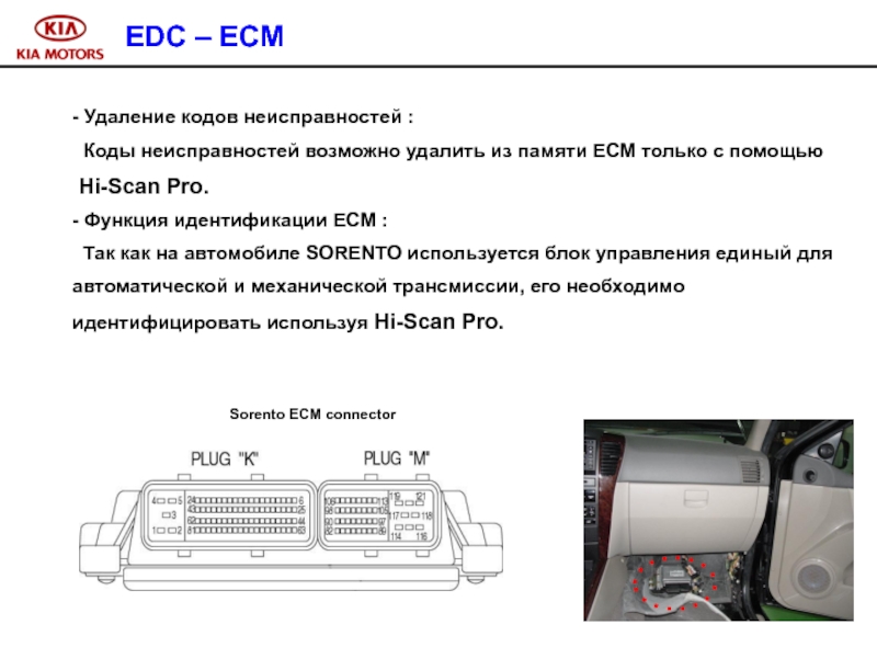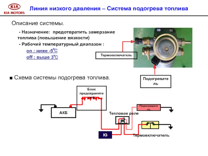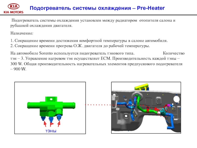На автомобиле Sorento используется подогреватель тэнового типа. Количество тэн – 3. Управление нагревом тэн осуществляет ECM. Производительность каждой тэны – 300 W. Общая производительность нагревательных элементов предпускового подогревателя – 900 W.
