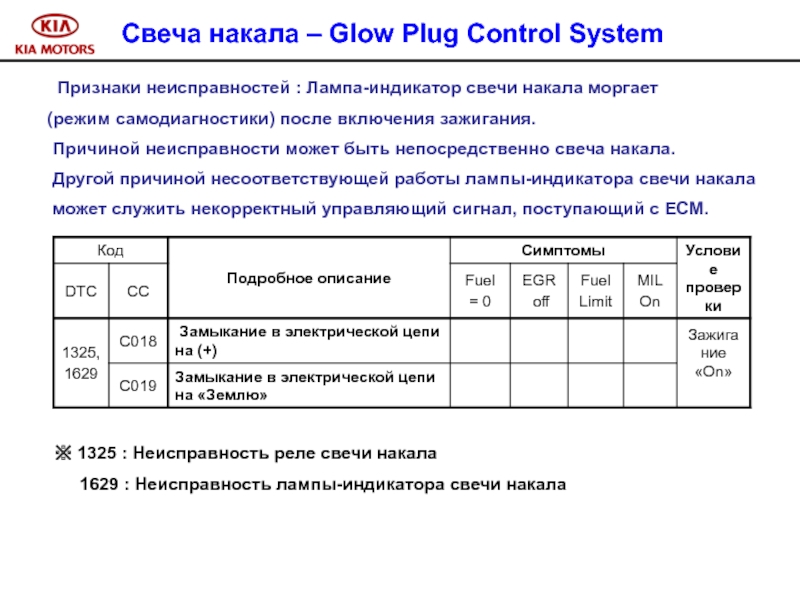 Слайд 107 Признаки неисправностей : Лампа-индикатор свечи накала моргает