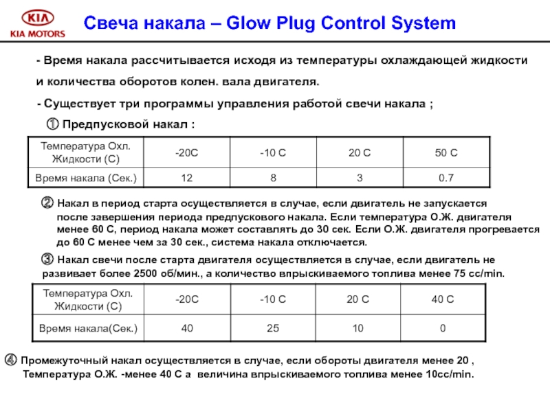 Слайд 106 - Время накала рассчитывается исходя из температуры охлаждающей жидкости