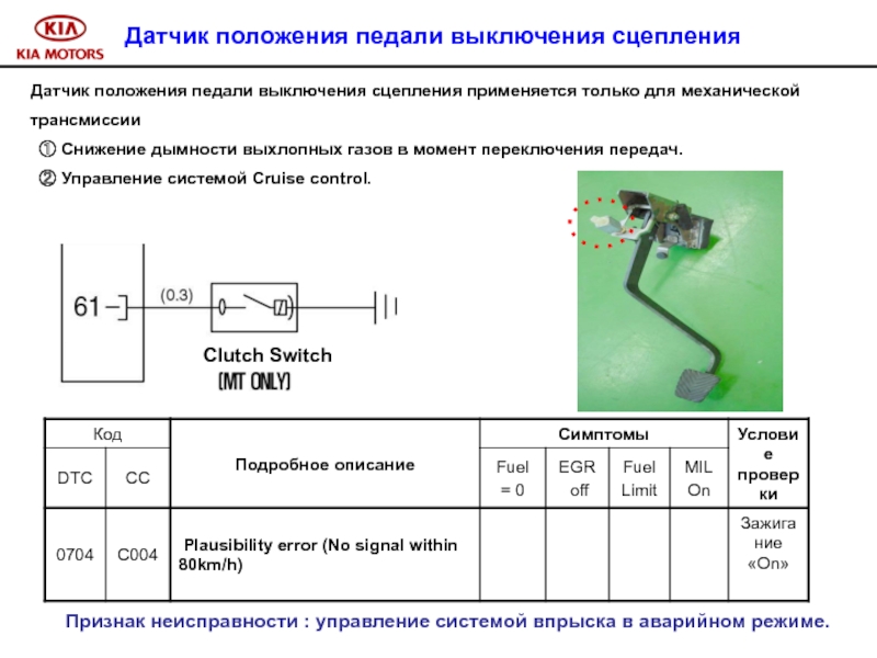Слайд 101 Датчик положения педали выключения сцепления применяется только для механической