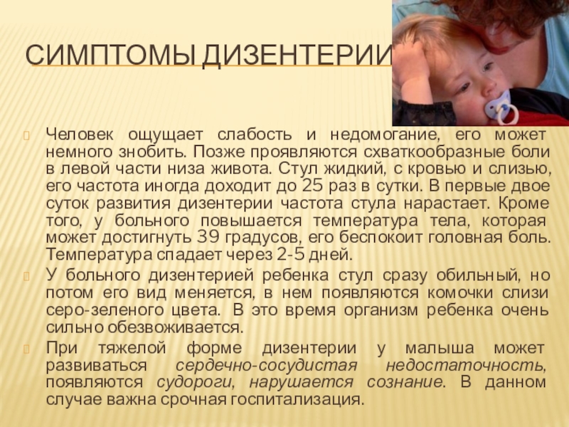 У больного дизентерией ребенка стул сразу обильный, но потом его вид меняется, в нем появляются комочки слизи серо-зеленого цвета. В это время организм ребенка очень сильно обезвоживается.