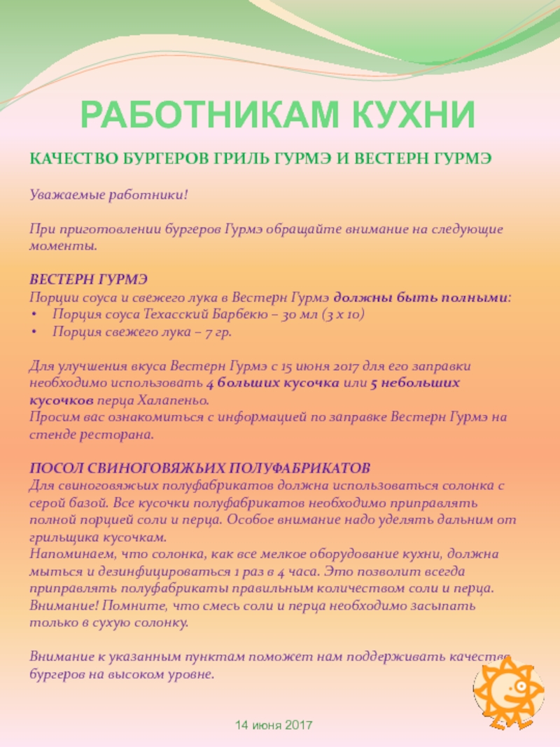 Внимание к указанным пунктам поможет нам поддерживать качество бургеров на высоком уровне.