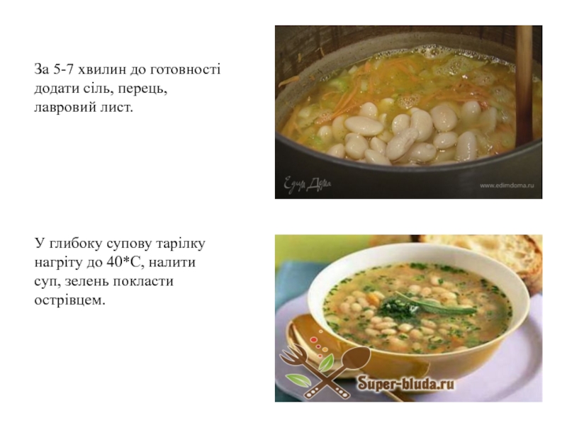 Слайд 10За 5-7 хвилин до готовності додати сіль, перець, лавровий лист.