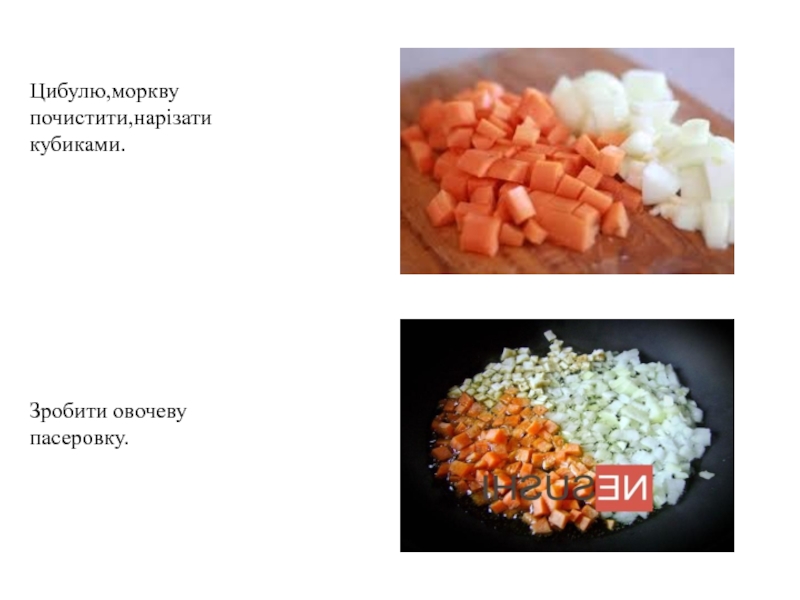 Слайд 8Цибулю,моркву почистити,нарізати кубиками.