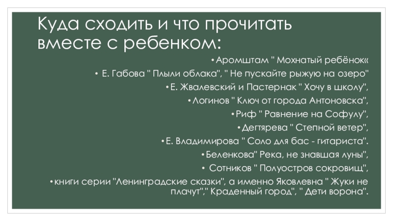 Слайд 15Куда сходить и что прочитать вместе с ребенком: