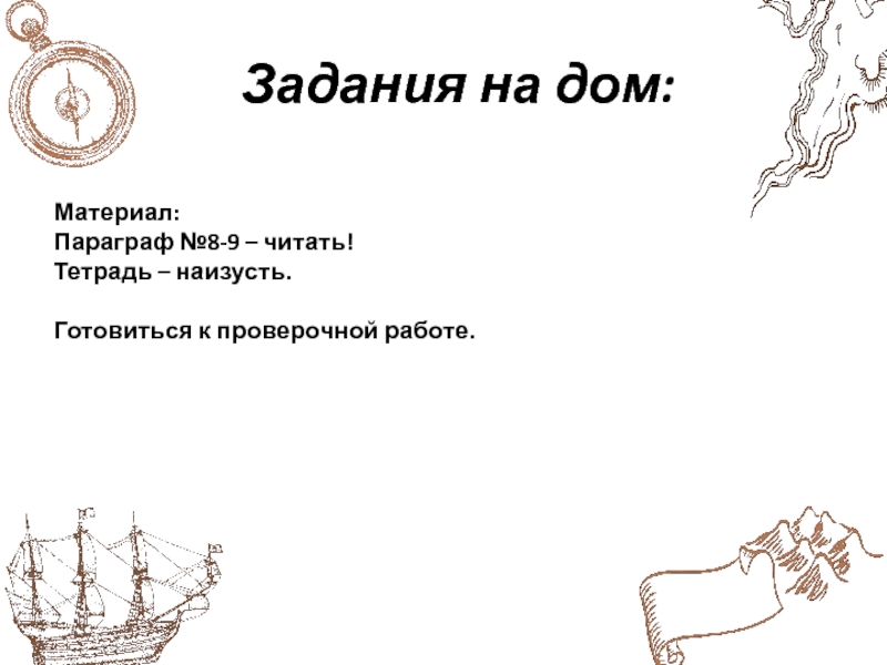 Задания на дом:Материал: Параграф №8-9 – читать!Тетрадь – наизусть.Готовиться к проверочной работе.