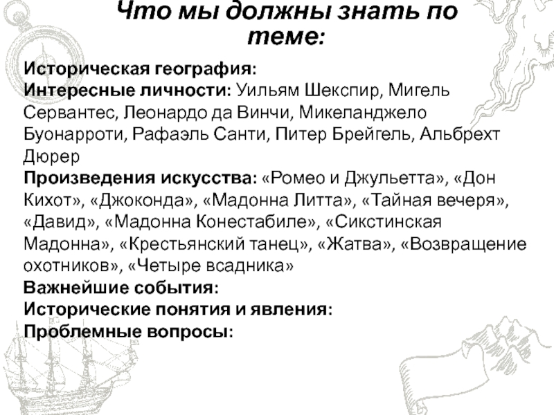 Что мы должны знать по теме:Историческая география: Интересные личности: Уильям Шекспир, Мигель Сервантес, Леонардо да Винчи, Микеланджело