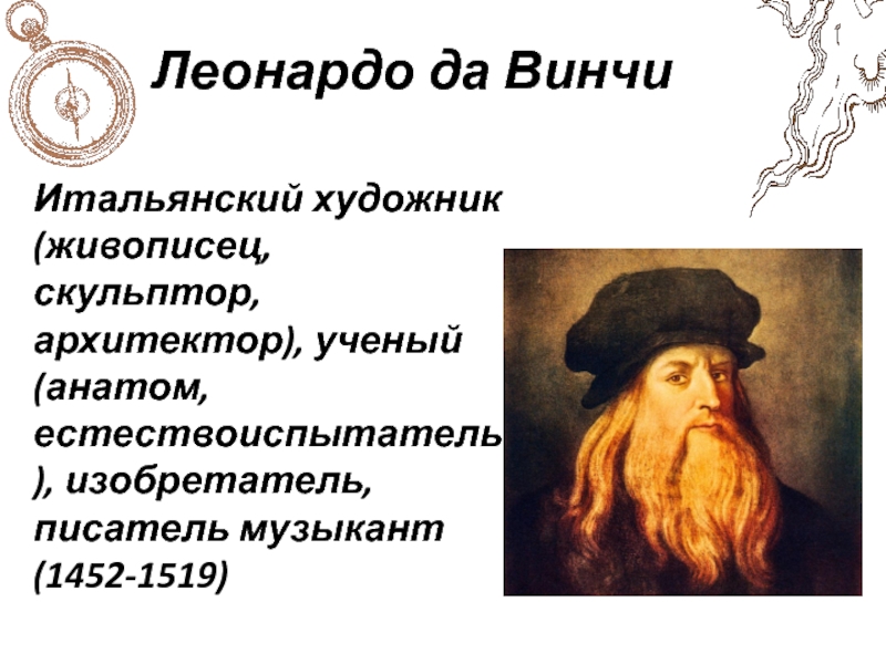Леонардо да ВинчиИтальянский художник (живописец, скульптор, архитектор), ученый (анатом, естествоиспытатель), изобретатель, писатель музыкант (1452-1519)