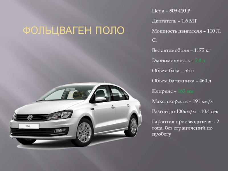 ФОЛЬЦВАГЕН ПОЛОЦена – 509 410 PДвигатель – 1.6 MT Мощность двигателя – 110 Л.С.Вес автомобиля – 1175 кгЭкономичность