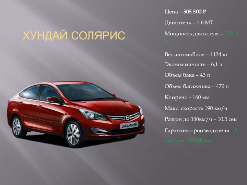 ХУНДАЙ СОЛЯРИС Цена – 505 500 PДвигатель – 1.6 MT Мощность двигателя – 123 Л.С.Вес автомобиля – 1134