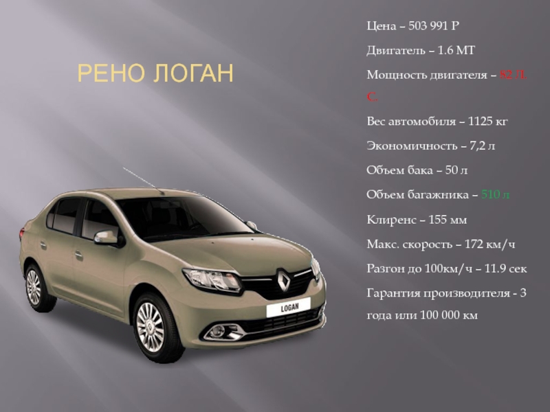 РЕНО ЛОГАНЦена – 503 991 PДвигатель – 1.6 MT Мощность двигателя – 82 Л.С.Вес автомобиля – 1125 кгЭкономичность