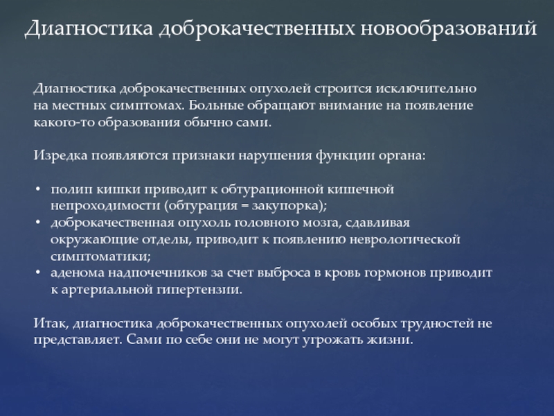 Диагностика доброкачественных опухолей строится исключительно на местных симптомах.