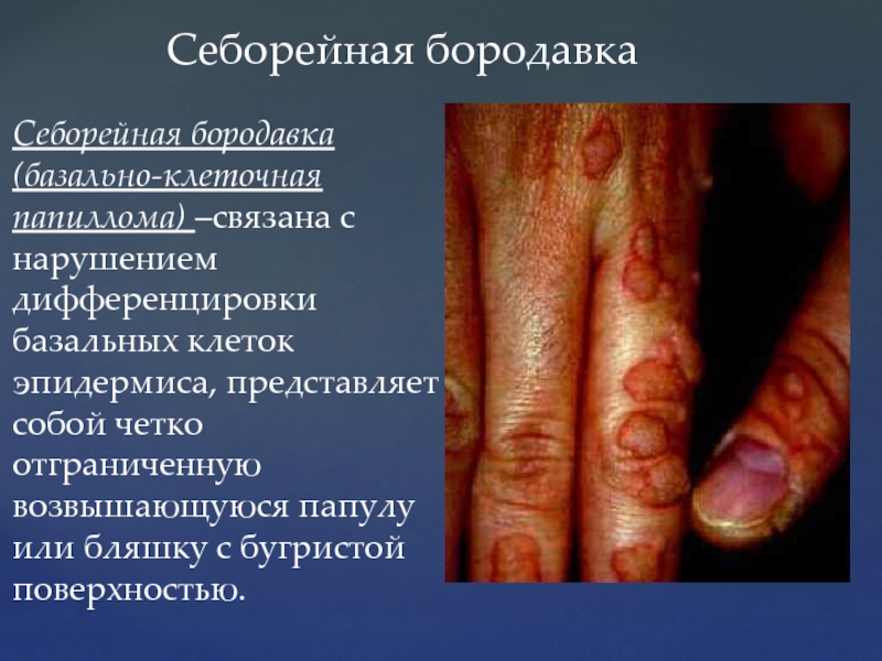 Слайд 10Себорейная бородавка (базально-клеточная папиллома) –связана с нарушением дифференцировки базальных клеток