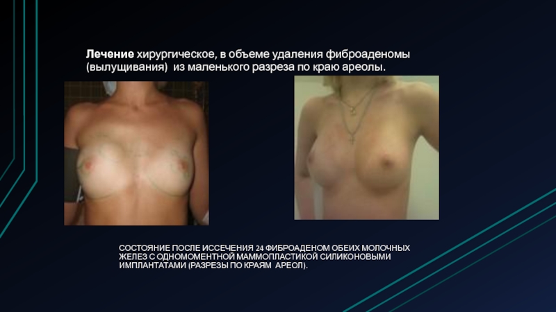 Слайд 8Лечение хирургическое, в объеме удаления фиброаденомы (вылущивания) из маленького разреза по