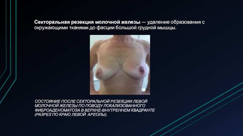 Слайд 19Секторальная резекция молочной железы — удаление образования с окружающими тканями до
