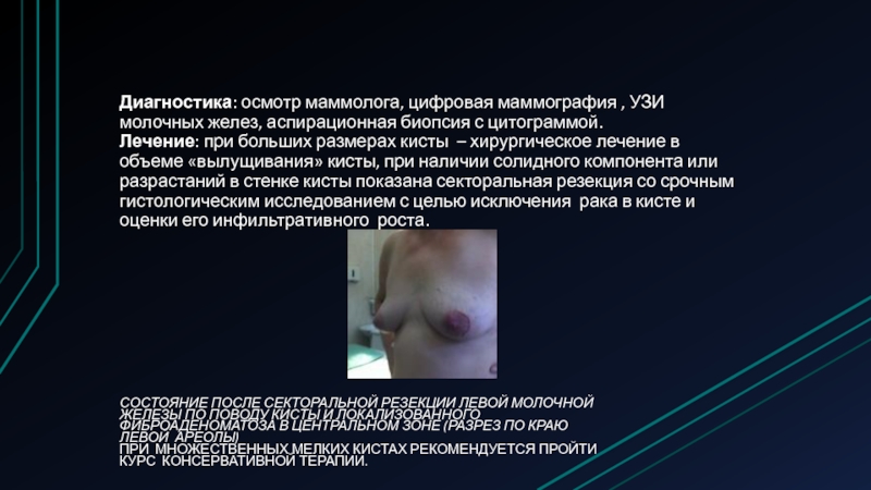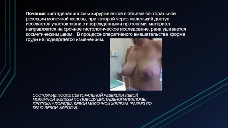 Слайд 17Лечение цистадепапилломы хирургическое в объеме секторальной резекции молочной железы, при которой