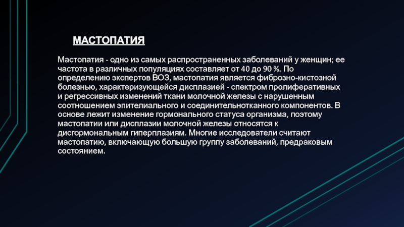 По определению экспертов ВОЗ, мастопатия является фиброзно-кистозной болезнью, характеризующейся дисплазией - спектром пролиферативных и регрессивных изменений ткани молочной железы с нарушенным соотношением эпителиального и соединительнотканного компонентов. В основе лежит изменение гормонального статуса организма, поэтому мастопатии или дисплазии молочной железы относятся к дисгормональным гиперплазиям. Многие исследователи считают мастопатию, включающую большую группу заболеваний, предраковым состоянием.