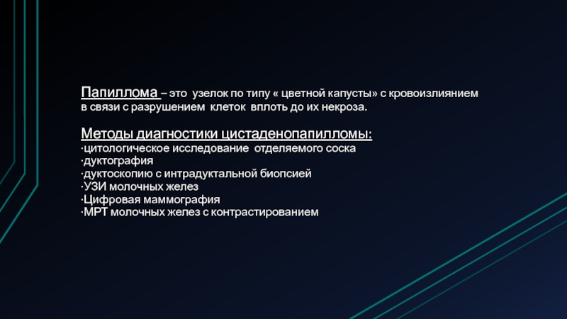 Слайд 13 Цистаденопапиллома (внутрипротоковая папиллома) – доброкачественная опухоль из эпителия протоков молочной железы.