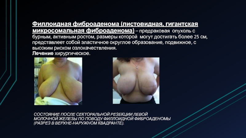 Слайд 9Филлоидная фиброаденома (листовидная, гигантская микросомальная фиброаденома) – предраковая опухоль с бурным,